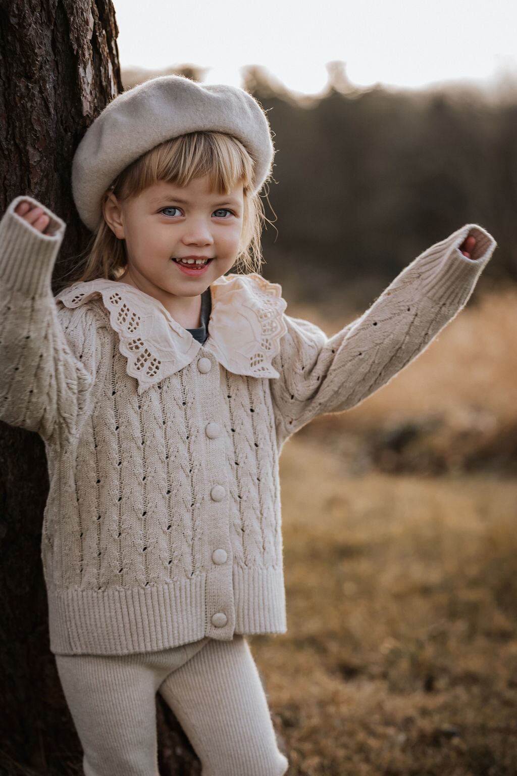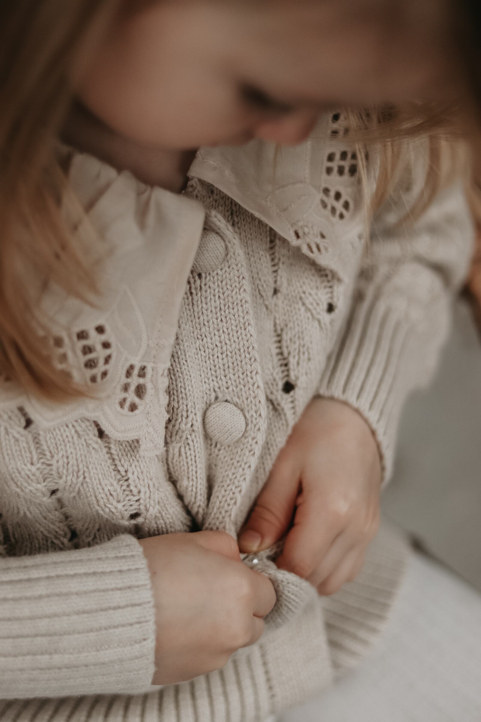レース襟がついたやわかい生地のカーディガンです。シンプルでどんなお洋服にも合わせやすいです。